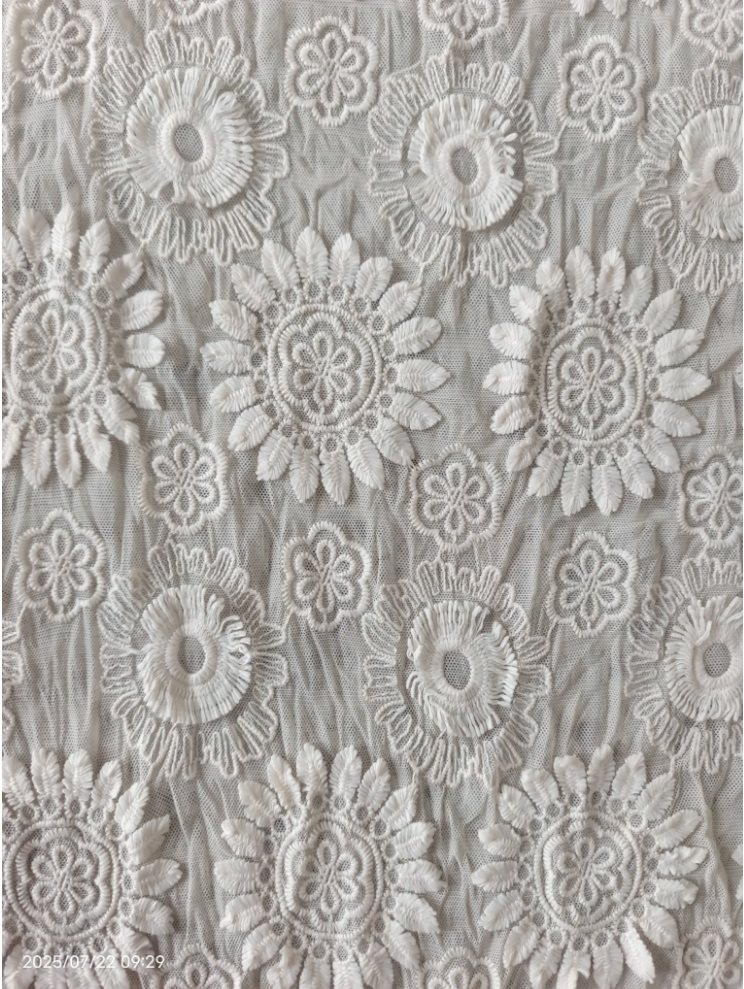 Cada rolo de tecido é engenheiro de precisão usando a tecnologia avançada de bordados digitais, garantindo densidade e uniformidade de pontos consistentes. O material base é respirável, mas estável, impedindo o enrugamento durante a costura e a manutenção da forma após a lavagem repetida. Disponível em tons neutros, bem como em cores ousadas, ele se integra perfeitamente a coleções prontas para vestir ou projetos de alta costura. Para os designers, oferece uma vantagem na criação de roupas que se destacam nas passarelas ou prateleiras de varejo. Para os consumidores, transforma as roupas do dia a dia em arte vestível - perfeitas para casamentos, galas ou passeios casuais onde a distinção é importante.